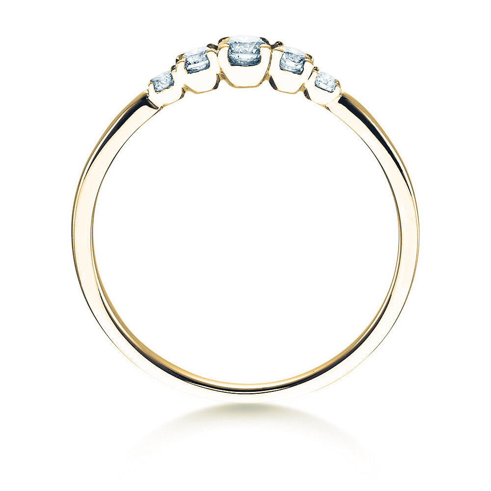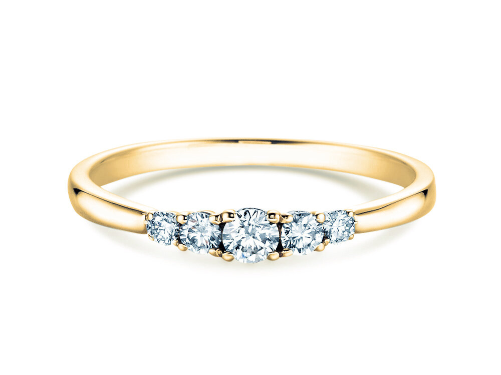 Un anello e una promessa. La tenera fascia del 5 Diamonds è incastonata con cinque diamanti sfavillanti. L'ordine delle pietre preziose fa apparire l'anello armonico e equilibrato. Una vera e propria opera d'arte. Ideale per portatrici che amano l'eleganza di classe e il design senza tempo. Il nostro consiglio: il 5 Diamonds d'oro bianco o di paltino.