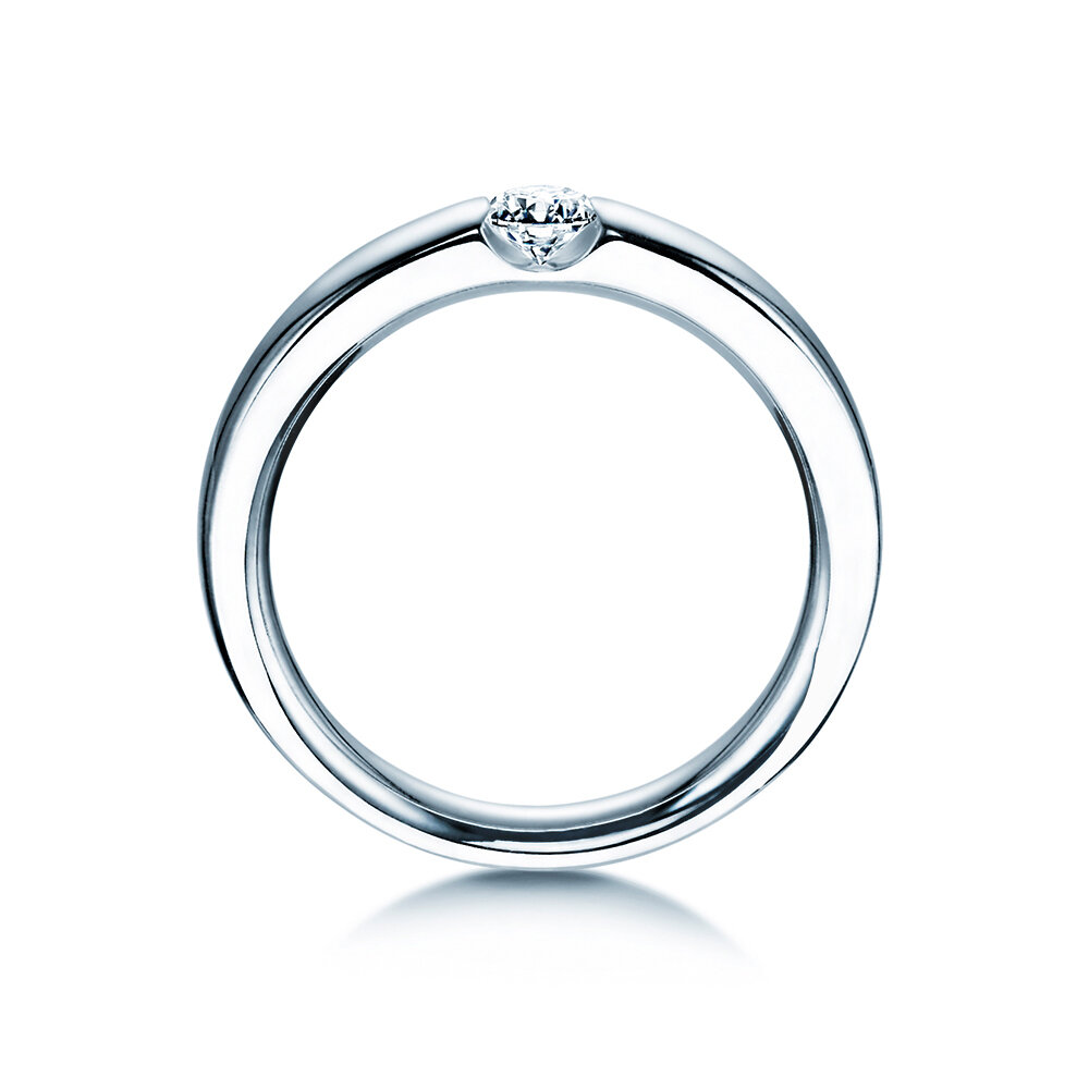 La moderna tipologia della montatura dell'anello tensione Destiny ha due vantaggi particolari: 1. Il diamante è ben mantenuto e 2. attraverso i lati arriva tanta luce. In questo modo il diamante può dispiegare la sua luminosità particolare. Il tracciato chiaro ed equilibrato della fascia dell'anello perfeziona il design elegantemente.