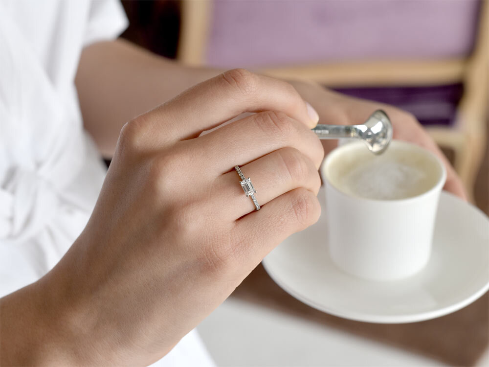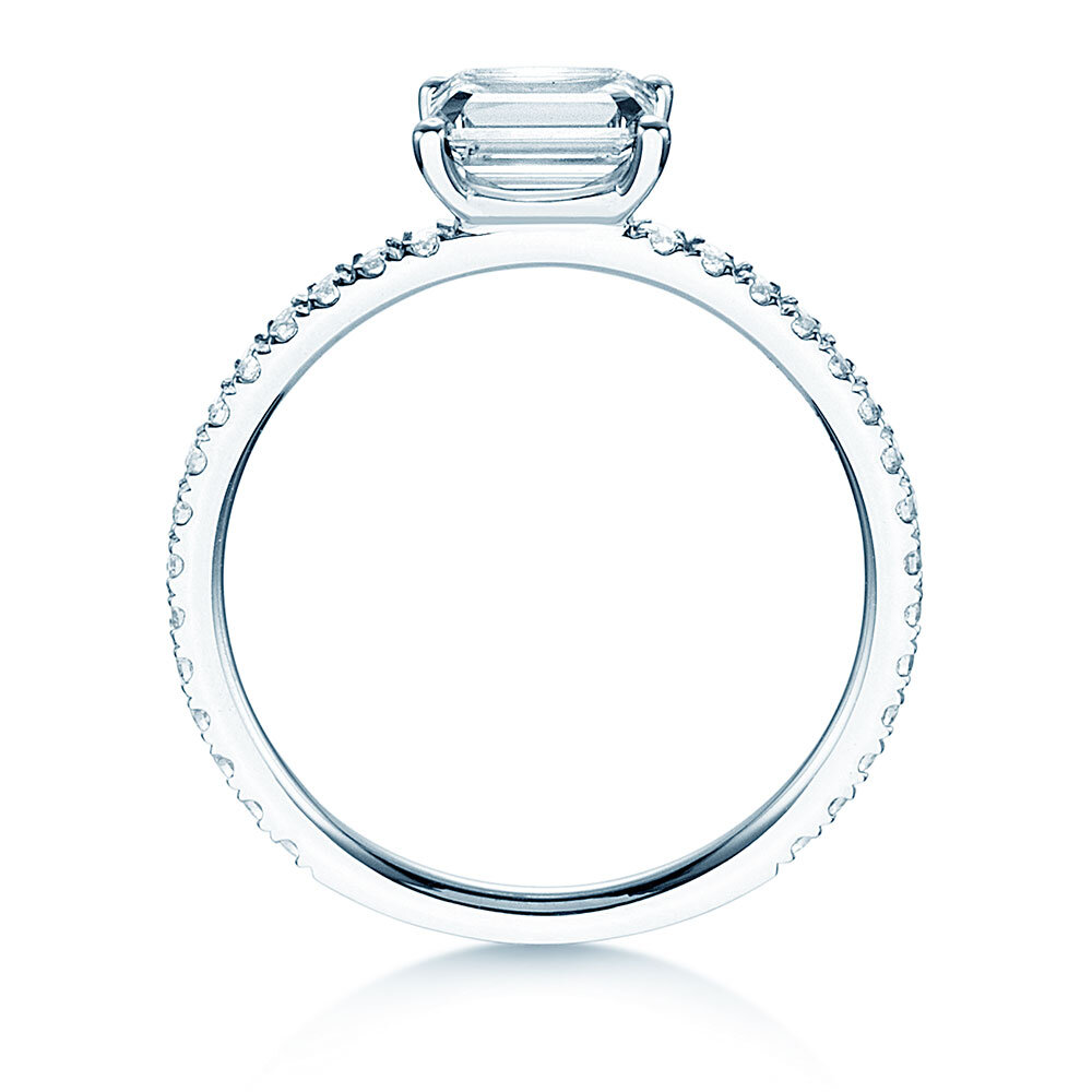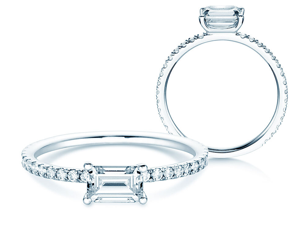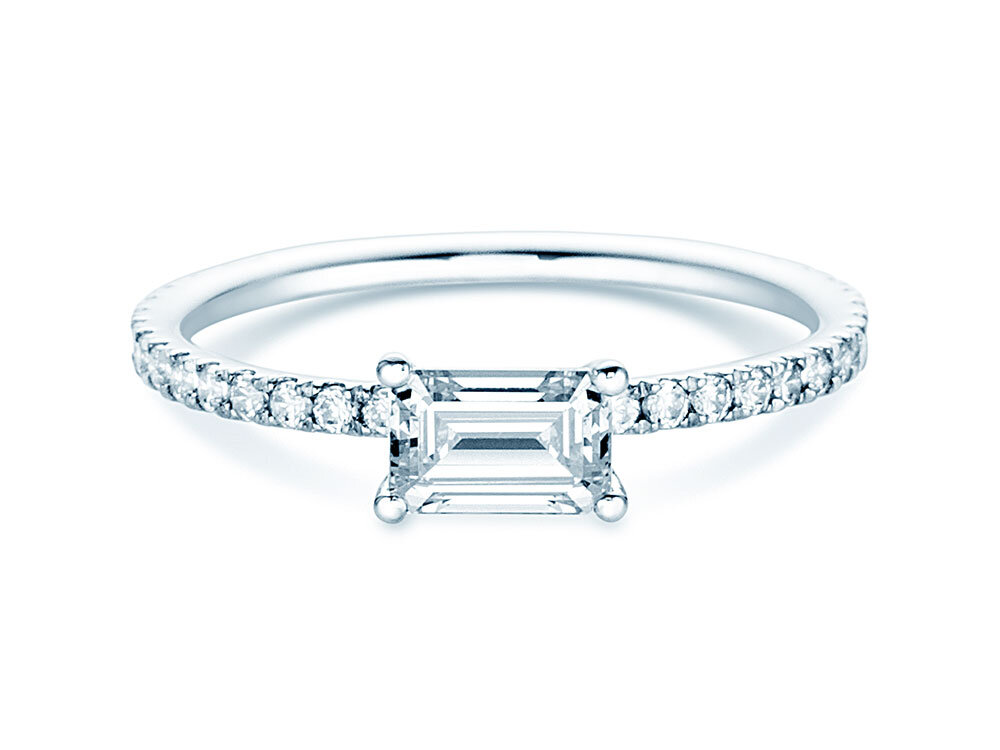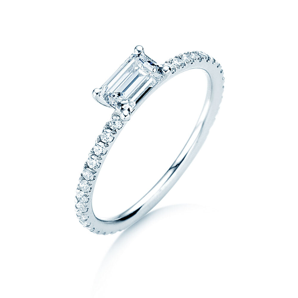 L'Emerald-Cut si presenta finemente lavorato e di filigrana. A scelta in quattro dimensioni del diamante da 0,20 ct. Nel canale precisamente forgiato sono incastonati diamanti pavé per un insieme di 0,24 ct.