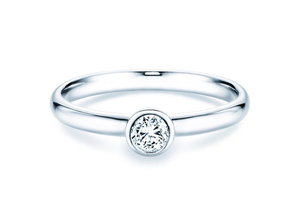 L'anello di fidanzamento Eternal mette in risalto il contorno rotondo del diamante con la sua montatura semplice ed intemporale con un castone. La fascia dell'anello d'oro bianco rende questo modello un classico moderno, come segno moderno d'amore. O scelga l'anello d'argento e riceve un diamante più grande per lo stesso budget.