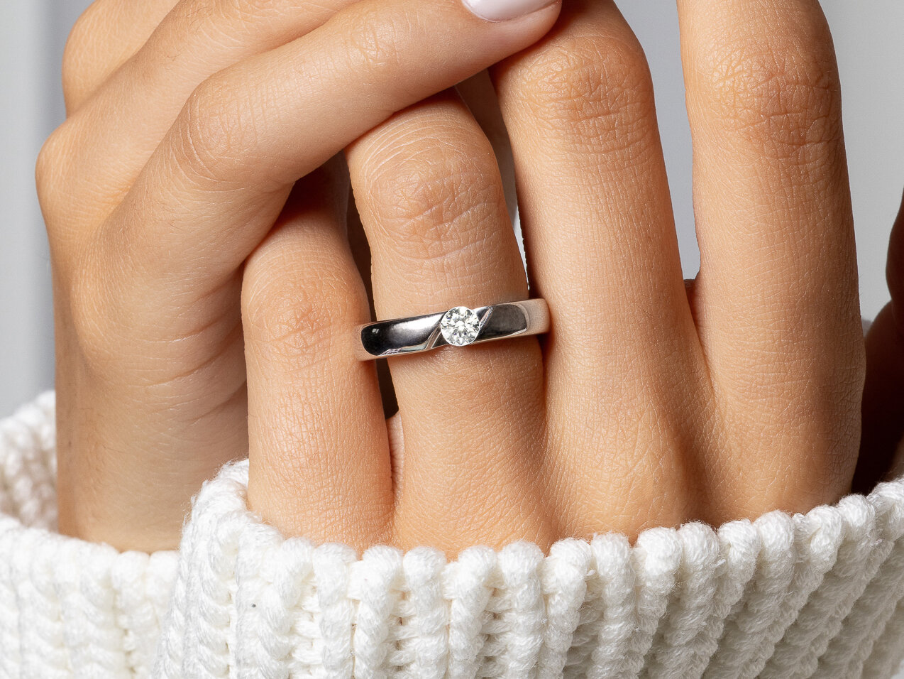 A prima vista un anello tensione, semplice ed elegante. Più nel dettaglio si vede la raffinatezza dell'anello di fidanzamento Italic con un diamante. Grazie alle parti aperte della fascia la luce raggiunge benissimo il diamante e lo fa risplendere con innumerevoli riflessi. Il diamante è collocato nella montatura diagonale.