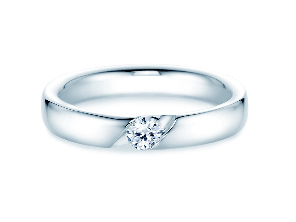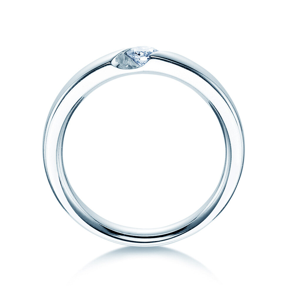 A prima vista un anello tensione, semplice ed elegante. Più nel dettaglio si vede la raffinatezza dell'anello di fidanzamento Italic con un diamante. Grazie alle parti aperte della fascia la luce raggiunge benissimo il diamante e lo fa risplendere con innumerevoli riflessi. Il diamante è collocato nella montatura diagonale.