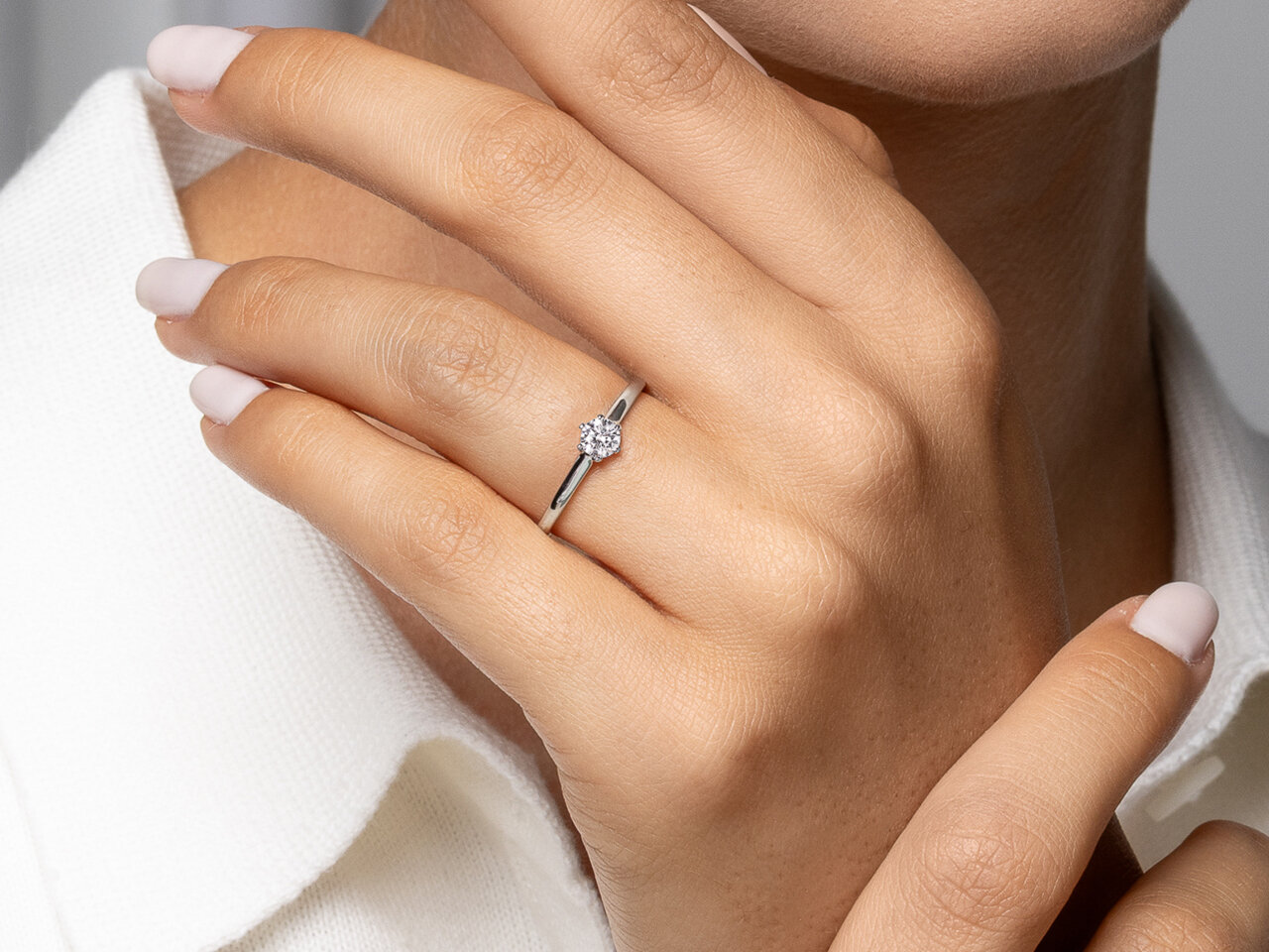 La montatura a griffe dell'anello di fidanzamento Madison è mantenuta bassa ed è ben modellata. Il diamante riceve luce sufficiente dai lati per creare una brillantezza senza eguali. Convincente è il design moderno della fascia dell'anello con i fianchi verso l'interno. Questo accorgimento dona all'anello leggerezza all'anulare – un vero punto in più per mani fini.