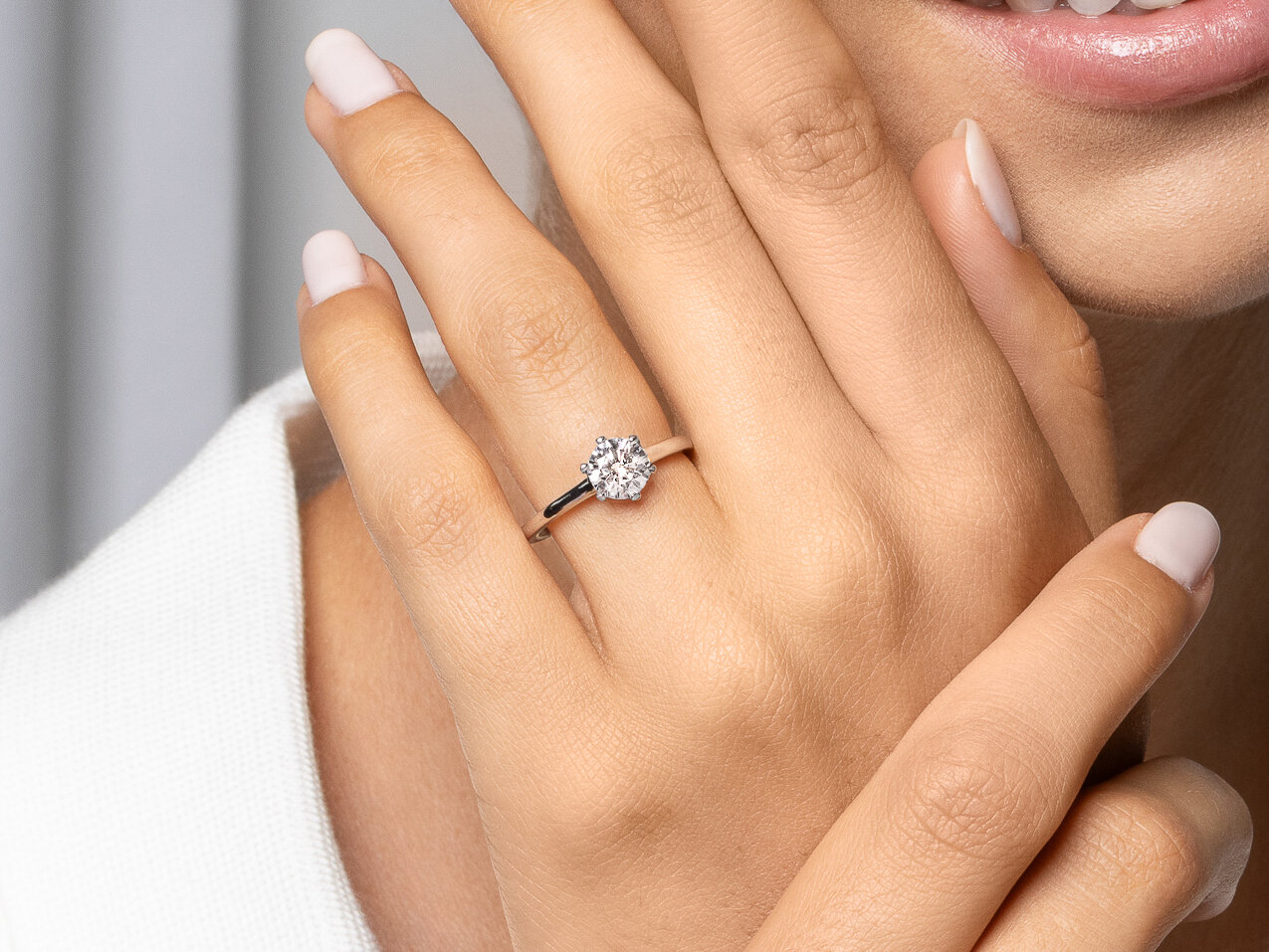La montatura a griffe dell'anello di fidanzamento Madison è mantenuta bassa ed è ben modellata. Il diamante riceve luce sufficiente dai lati per creare una brillantezza senza eguali. Convincente è il design moderno della fascia dell'anello con i fianchi verso l'interno. Questo accorgimento dona all'anello leggerezza all'anulare – un vero punto in più per mani fini.