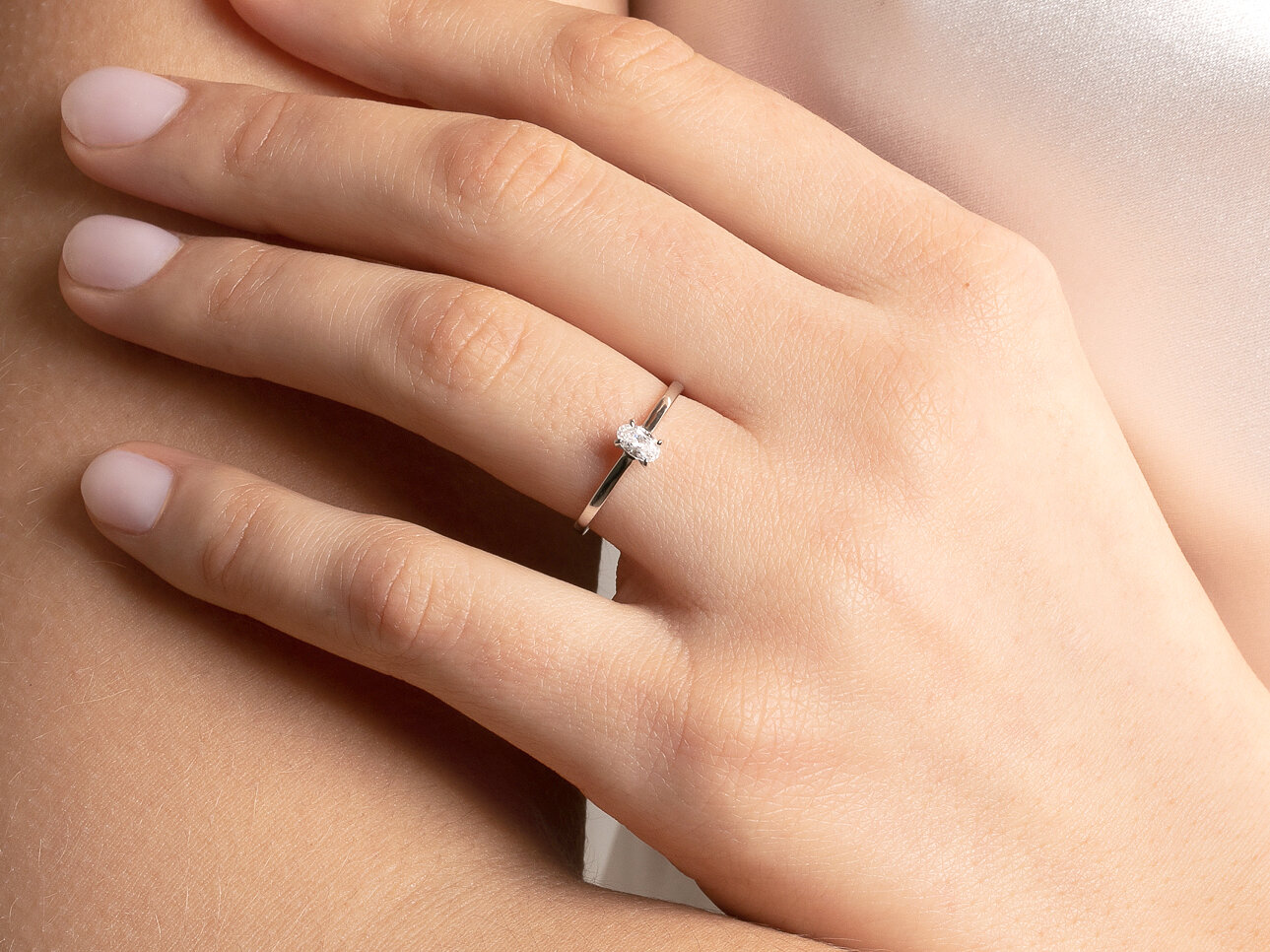 Eleganza semplice, l'anello di fidanzamento Oval Cut combina una semplice e graziosa fascia dell'anello solitario con un diamante Oval Cut. Questa serie è disponibile con il diamante di svariate dimensioni.