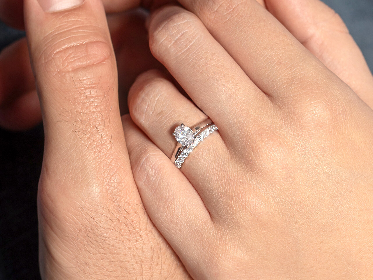 Eleganza semplice, l'anello di fidanzamento Oval Cut combina una semplice e graziosa fascia dell'anello solitario con un diamante Oval Cut. Questa serie è disponibile con il diamante di svariate dimensioni.