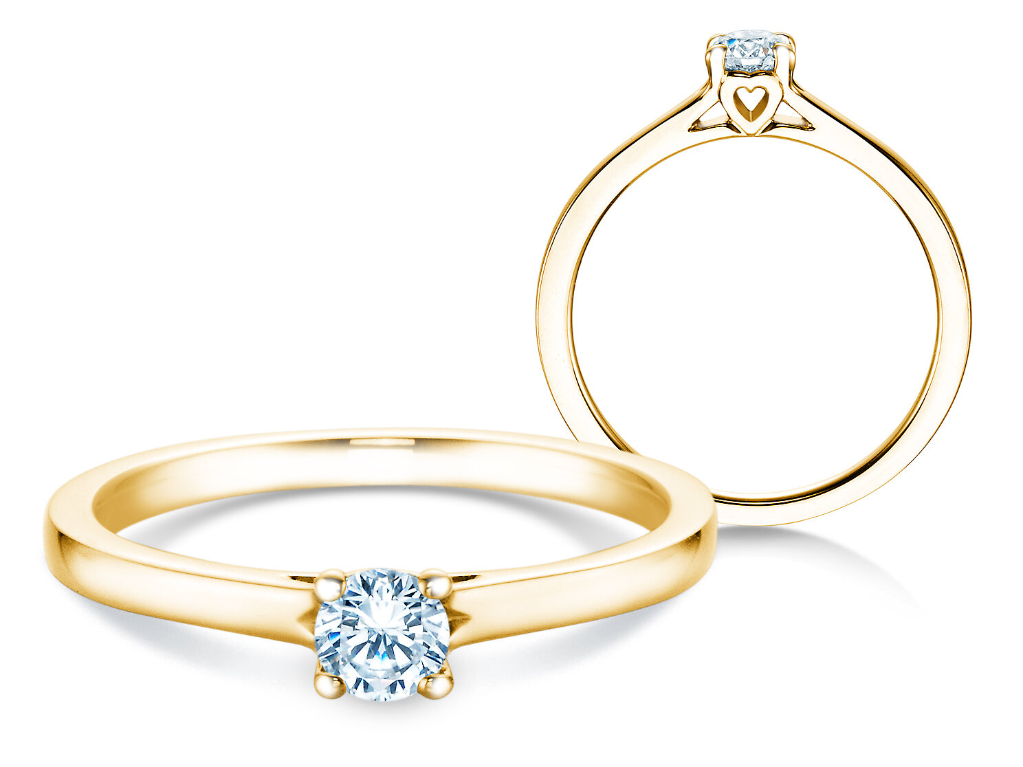 L'anello di fidanzamento col cuore. L'highlight romantico del solitario Romance è la montatura a forma di cuore. Una prova ben visibile della promessa di amore eterno. Il diamante luccicante è mantenuto da una montatura con griffe. Così la brillantezza della pietra viene perfettamente valorizzata. L'anello solitario Romance è un omaggio a tutte quelle donne che amano e vivono coscientemente la femminilità.