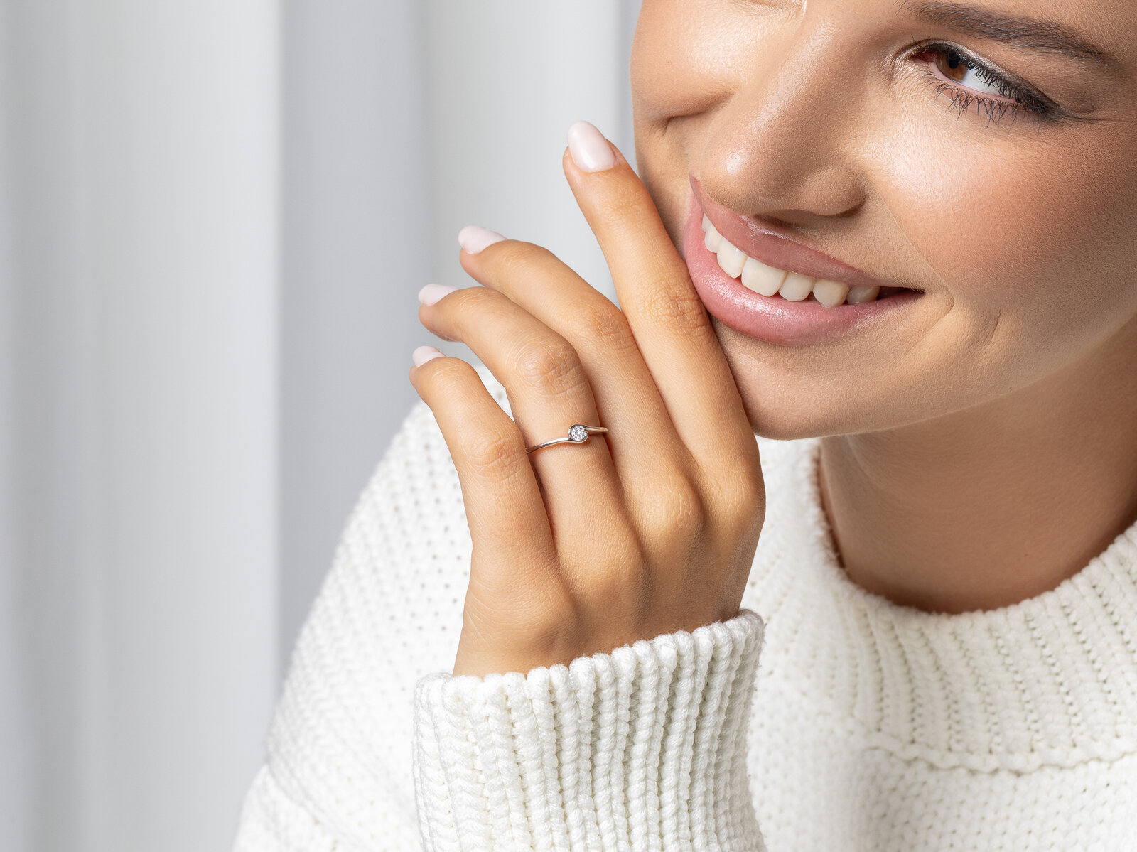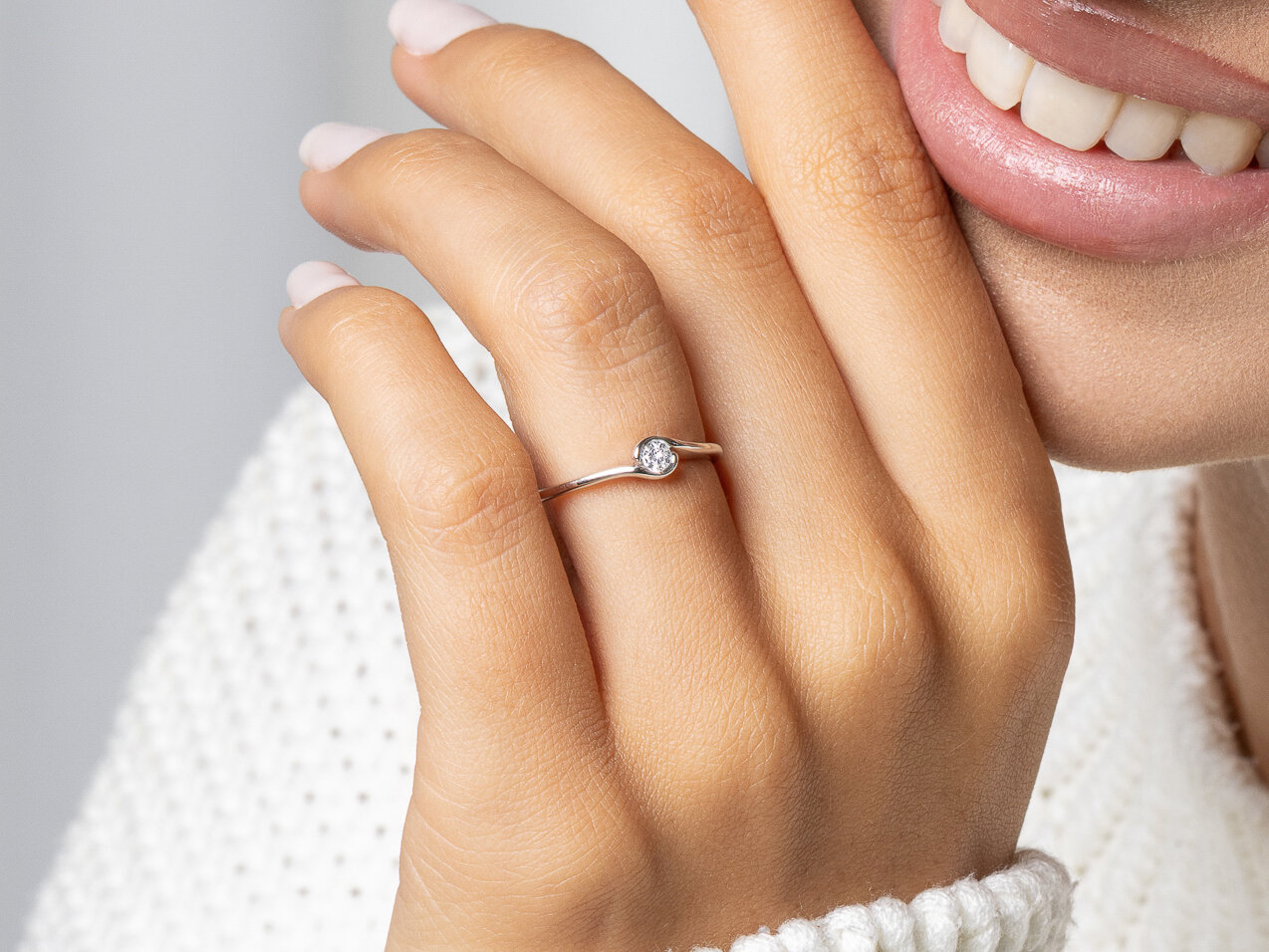 La fascia dell'anello si adagia da ambedue le parti attorno al diamante brillante proteggendolo. Con l'anello di fidanzamento Touch abbiamo reinterpretato il classico anello tensione. Un gioiellino ricco di raffinatezza.